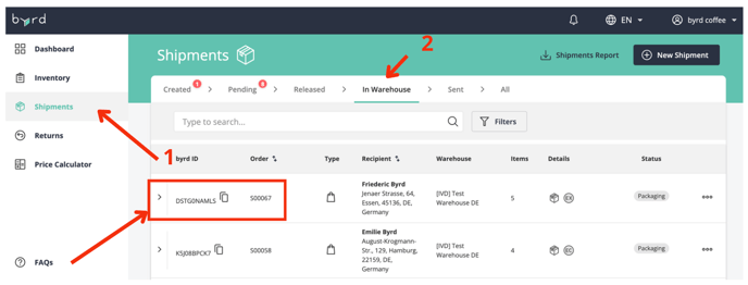 - Dans l’envoi concerné, cliquez sur la flèche à côté de l’ID byrd pour afficher une vue détaillée.